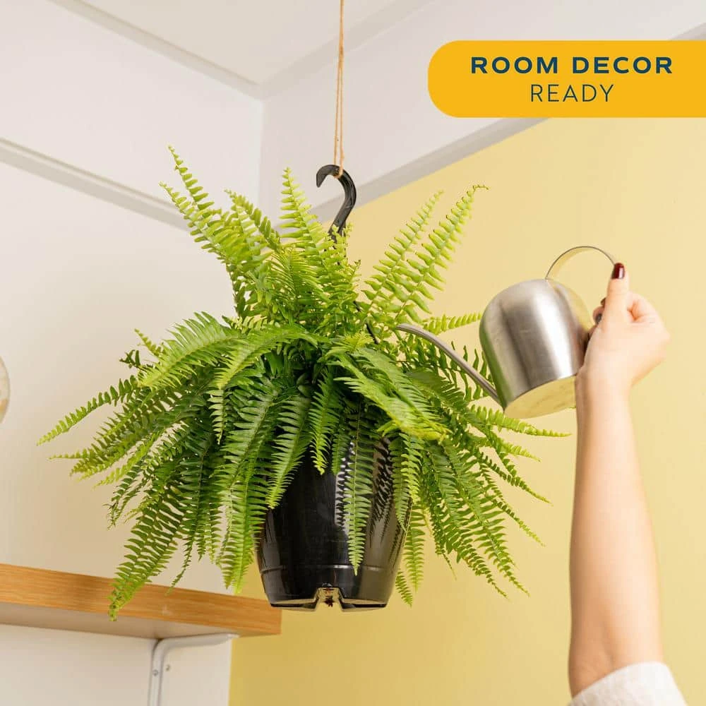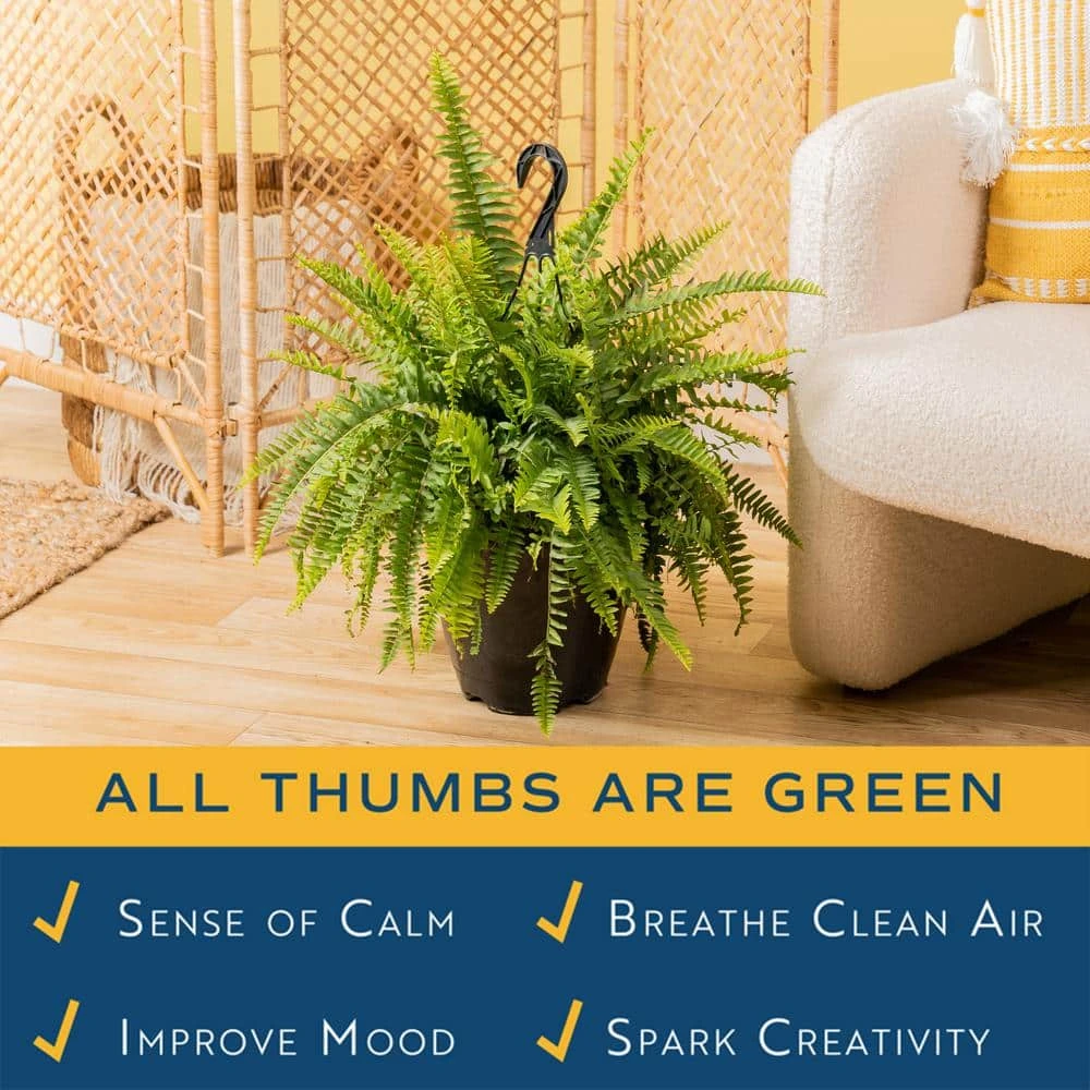 Enjoy the beauty of Boston Fern from Costa Farms, which features solid, green foliage and is fantastic for large spaces. Not only are Boston Ferns striking, they help purify the air by removing unhealthy organic compounds. Grow Boston Fern in bright, indirect sunlight. Water it about twice a week with approximately 2-3 cups. Ensure excess water drains. Adjust as needed for your environment. Never let Boston Fern sit in water or saturated soil. When shipped, its about 16 in.es tall, measured from the bottom of the pot to the top of the plant. Boston Fern ships in a black, 10 in. grower pot inside a hanging basket. To help with water drainage, this container does have holes. Boston Fern is generally a slow grower, depending on environment and care provided. Boost growth in Spring and Summer with a fertilizer labeled for potted plants following the products instructions. When Boston Fern outgrows its current container, repot by gently removing it from its container and placing it in a 2 in. wider container. Fill with potting mix and water thoroughly. Hardy outdoors in USDA Zones 9-10. Exposure to the sap of this plant may cause discomfort to individuals with a sensitivity to it upon contact. Grown for ornamental purposes and not intended for human or animal consumption.