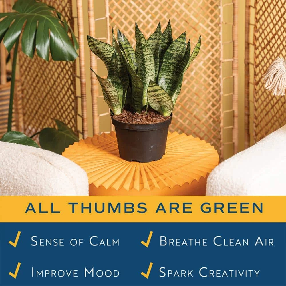 Costa Farms Snake Plant has it all – beauty, easy care, and a style that works with any decor. Practically indestructible, Snake Plant will even thrive on neglect. Snake Plant, often called Mother-In-Law’s Tongue, is a classic beauty that fits perfectly in any setting. Not only are Snake Plants striking, they help purify the air by removing unhealthy organic compounds. The plants grow slowly and steadily and look terrific in any style of pot or container. An African native, Snake Plant can also be grown in the landscape in frost-free regions. This tall, strappy leaf requires minimal care and adds instant beauty to your home or office. Did you know that keeping plants in your office makes you more productive. Recent studies prove it! Snake Plant also makes a great housewarming gift. (Everyone loves plants, especially ones that are low maintenance.) Snake Plant adds lush vibrancy to indoor decor. This is the ideal houseplant for living rooms, hallways, dens, patios, and bedrooms.