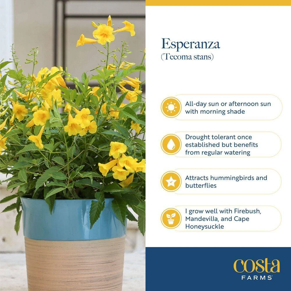Esperanza is a beautiful subtropical shrub loved for its clusters of brilliant yellow trumpet-shaped flowers. Native to areas of North America like Texas and Arizona, it attracts butterflies, hummingbirds and other pollinators. Once established, it’s heat and drought tolerant, so it requires little care-allowing you (and the butterflies and hummingbirds) to enjoy its abundant natural beauty.